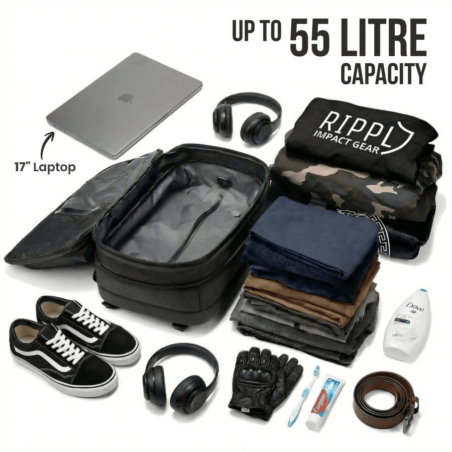 The Rydepak™ solves both. Vacuum compression gives you up to 40% more space, so you never leave kit behind. And with breathable mesh backing, padded shoulder straps, and a rigid frame that locks to your body, you'll forget it's even there. Ride all day. Carry everything. No compromise.